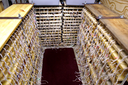 Every year we make between 500 and 600 lbs. We've progressed to running two grinders and two stuffers at a time. We do cheat now and use electrical zip ties insted of tying with string , it's so much faster. We still tie loops of string and attach them with the tie for honging. He also included a picture of an Easter pie with the sopressata inside (see his Easter pie recipe).